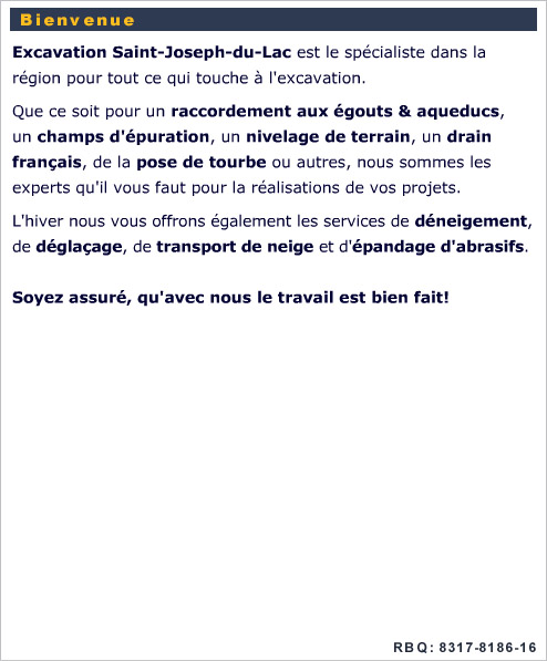 Site Internet réalisé par SiteXtra - Annuaire SiteXtra Excavation Saint-Joseph-du-Lac - Deneigement - Champ d'epuration - Raccordement - Excavation Nivelage de terrain - Drain francais - Pose de tourbe - Deglacage - Saint-Eustache - Deux-Montagnes